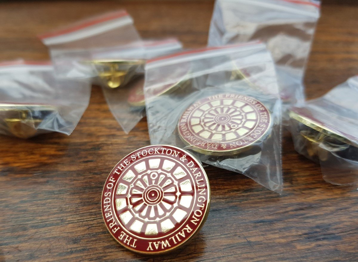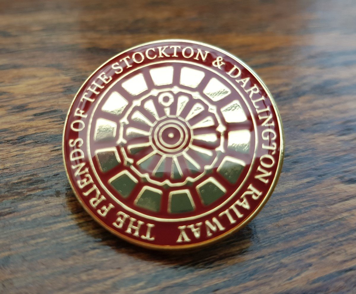 A lovely gold and maroon enamel metal badge showing a plugwheel and written around the edges, THE FRIENDS OF THE STOCKTON & DARLINGTON RAILWAY. The badge measures 25mm in diameter