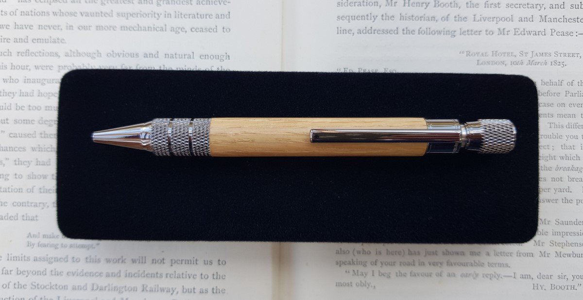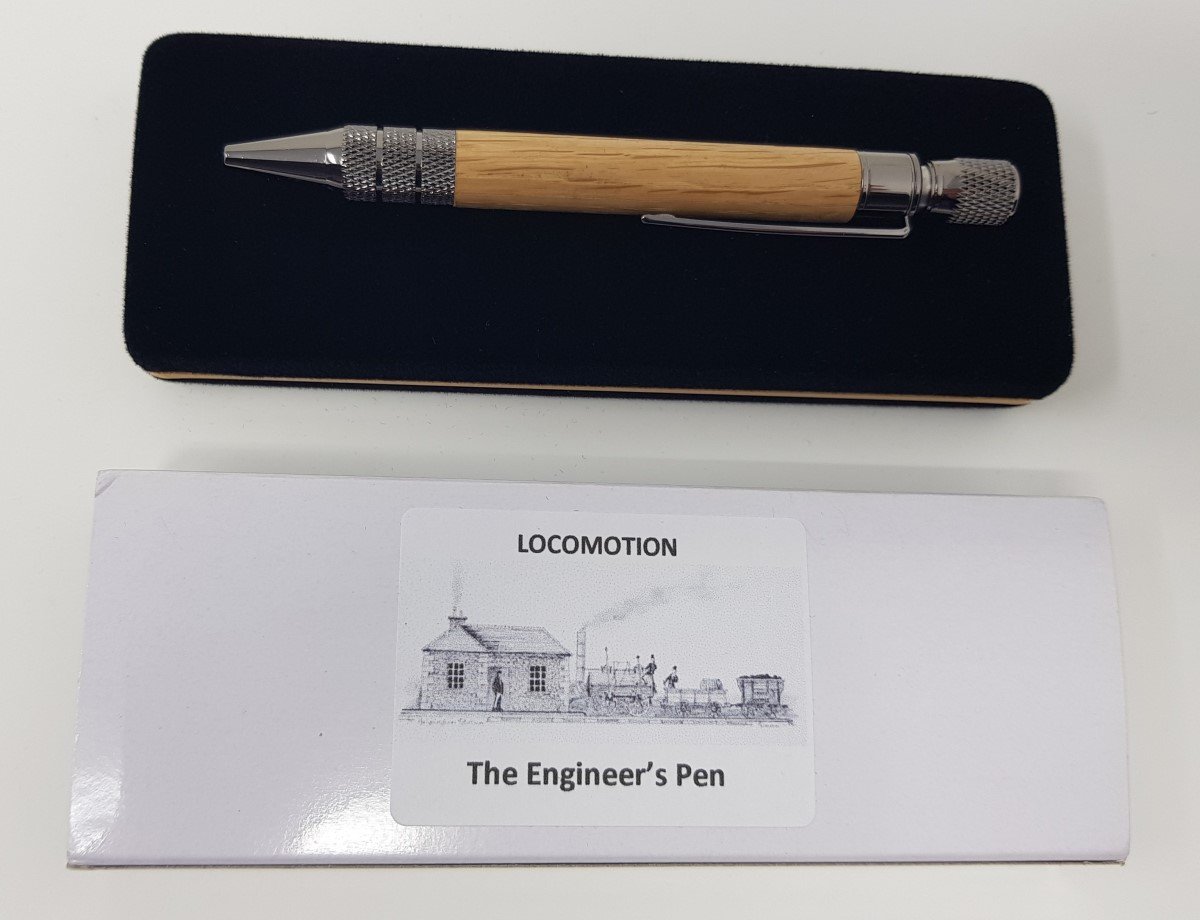 Heighington Station was commissioned by the Stockton & Darlington Railway in 1826. It is recognised as the earliest railway station in the world and is known to be the place where Locomotion No.1 was first placed on the rails in 1825 and where its boiler exploded in 1828. I am the artisan pen maker Andrew Simmons and am also the Great Great Great Grandson of John Falcus Carter the stonemason who designed and oversaw the building of Heighington Station. Because the Grade II* listed building is now officially recognised as ‘at risk’ the charity, ‘The Friends of the Stockton & Darlington Railway’ are seeking to purchase the property through a fund raising appeal. They need to raise £100,000 in order to qualify for the significant extra funds needed. I have therefore designed and produced a range of pens specifically to assist. I am donating 100% of proceeds from the sale of these pens to the appeal. The pens are called ‘Locomotion’ and there are currently two designs, The Engineer’s pen and the Director’s pen. Look out for more designs coming soon using historic timber from railway locations.