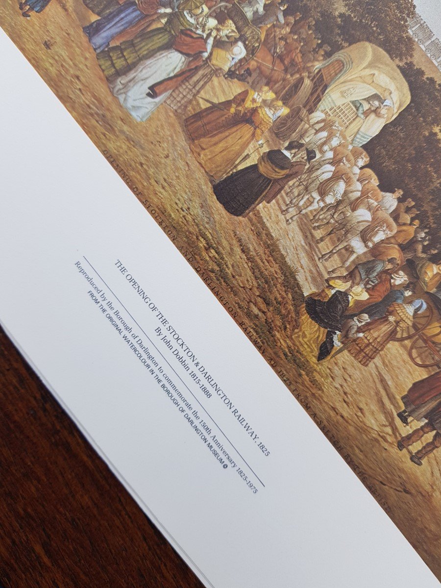 These prints were donated to The Friends of the S&DR by Darlington Borough Council. They were found when clearing out the Head of Steam Museum ready for major investment works to turn it into Hopetown. They were printed in 1975 by Darlington Borough Council as part of the 150th anniversary celebrations and the print was taken from the original painting which the council owns.