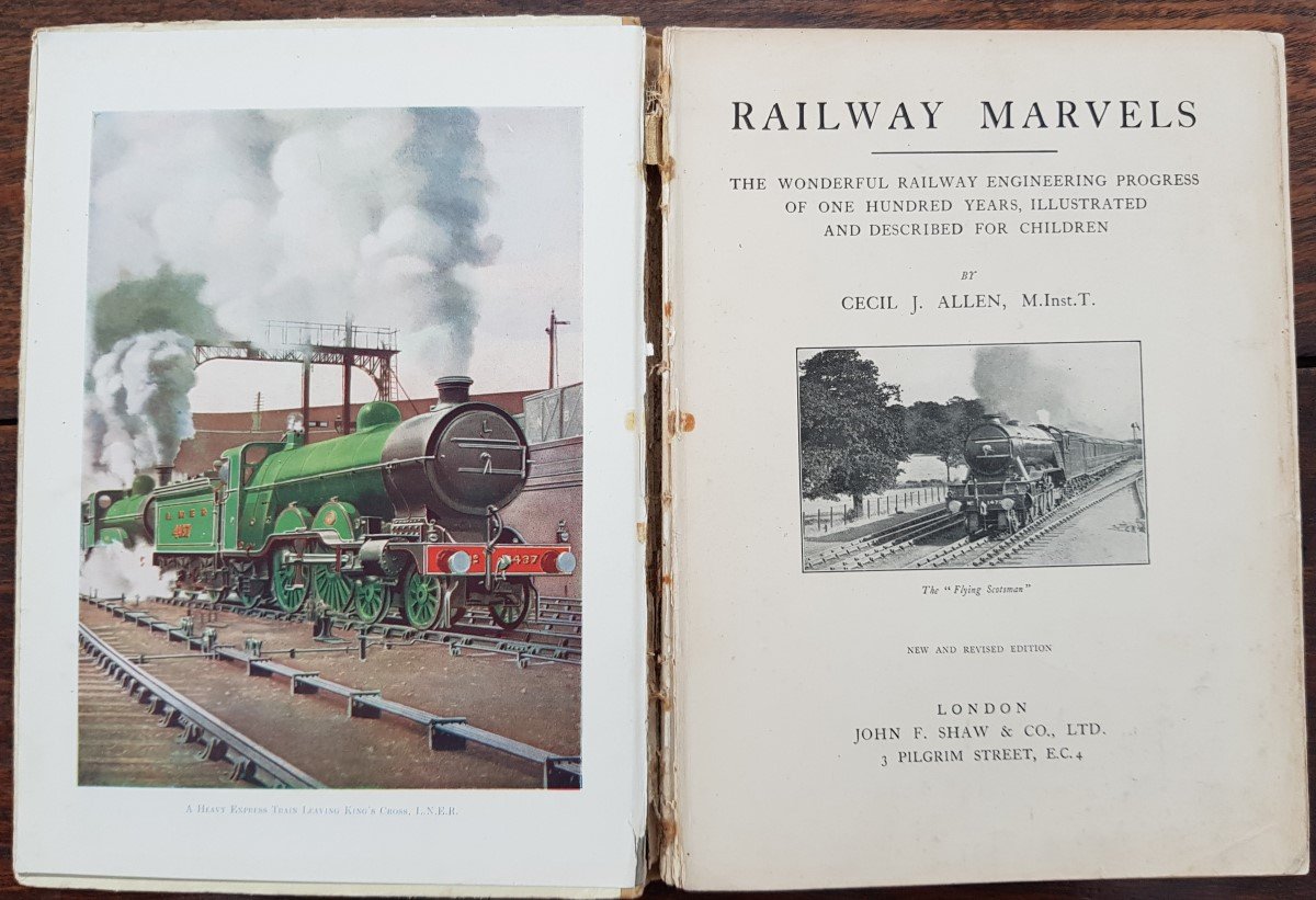Railway Marvels hardback book for children by Cecil J. Allen, first published c.1928, but this is a new and revised edition. It’s full title is ‘Railway Marvels. The Wonderful Railway Engineering Progress of One Hundred Years, Illustrated and Described for Children.’ Previously belonged to Peter Holmes who was given this for his 4th birthday on the 16th February 1933 by Kenneth. It did the job because Peter became a lifelong railway enthusiast and went on to publish books about the Stockton & Darlington Railway. So if you want to enthuse someone about railways and have hours of interest yourself, then this ancient and delightful book, could become your companion too. We suggest that it is a little grown up for day’s 4 year old though. Beautifully illustrated in colour and black and white and full of stories, descriptions, technical details and just everything you could want to know about Railways. If we had more storage space we’d hang on to this lovely, fully provenanced book.